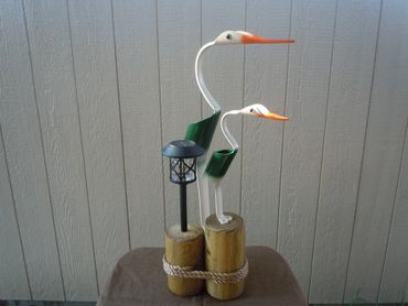 Nautical birds are created locally from our unique patterns. Made from plastic PVC, mounted on treated posts with solar lights included. A great addition to your beach house, boat dock, flower garden, swimming pool, and other settings.
